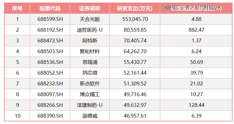 其中,天合光能(688599.SH)以*性優(yōu)勢占據(jù)研發(fā)榜單*名,達55.30億元,占營收比為4.88%;迪哲醫(yī)藥-U(688192.SH)研發(fā)支出位居第二,為8.06億元,占營收比為882.47%;阿特斯(688472.SH)研發(fā)支出位居第三,為7.04億元,占營收比為1.37%。