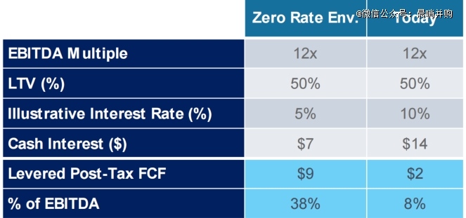 如圖3顯示,在“上一周期”一筆貸款價值比為50%、EBITDA利潤率目標(biāo)為15%、定價為12倍的并購交易中,利息支出從5%上升到10%,企業(yè)將其不到10%的EBITDA轉(zhuǎn)化為自由現(xiàn)金流,與之前零利率環(huán)境下的同一企業(yè)相比減少了約80%。