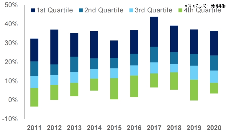 最后,并購策略可以幫助私募股權(quán)投資組合回報趨勢更加平滑,通常比風(fēng)險投資或成長型股權(quán)投資的回報呈現(xiàn)更小的波動性。