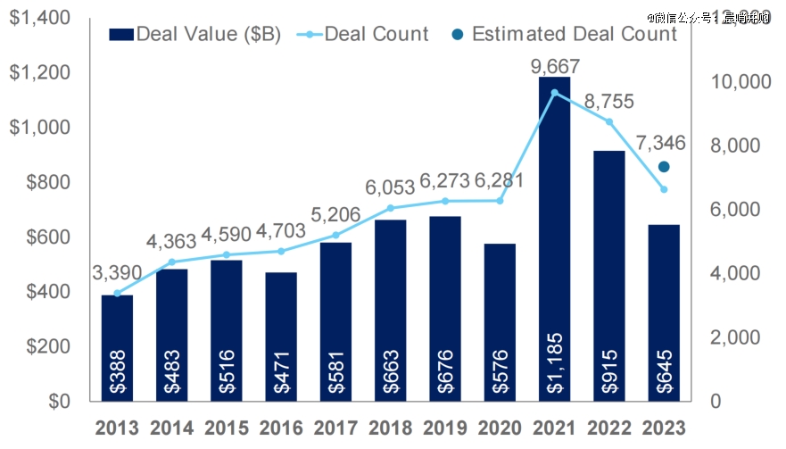 首先,我們從市場數(shù)據(jù)出發(fā)。2023年,并購基金的交易活動下降了29.5%(見圖1),同時因為基金的平均關(guān)閉期限延長至15.3個月(自2011年以來的最高點),LP的投資資本承諾放緩。并且,并購?fù)顿Y的退出價值也下降了26.4% 。