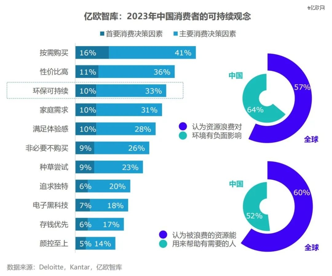 億歐智庫調(diào)研發(fā)現(xiàn),2023年,“環(huán)??沙掷m(xù)”成為消費(fèi)者們的主要消費(fèi)決策因素之一。進(jìn)入理性消費(fèi)的時(shí)代,消費(fèi)者在購買行為中獲得安全感的需求遠(yuǎn)高于沖動(dòng)消費(fèi)時(shí)產(chǎn)生的多巴胺??沙掷m(xù)消費(fèi)所體現(xiàn)的對(duì)于安穩(wěn)、安全、長遠(yuǎn)、美好的追求是對(duì)消費(fèi)者社會(huì)情感訴求的反射。