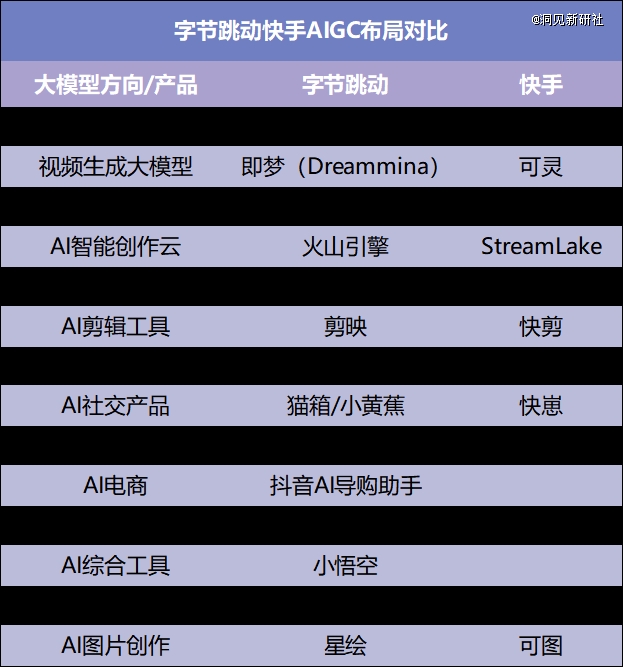 通用大模型方面,快手有快意,字節(jié)有豆包;AI圖片創(chuàng)作快手有可圖,字節(jié)有星繪;視頻生成大模型,快手有可靈,字節(jié)用即夢(mèng)相對(duì),此外在AI音樂、剪輯工具、社交產(chǎn)品、*制作等多個(gè)領(lǐng)域,快手和字節(jié)都有相應(yīng)的AIGC產(chǎn)品形成競對(duì)。