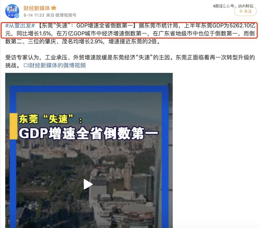 東莞上半年在萬億GDP城市中,經(jīng)濟增速倒數(shù)*。