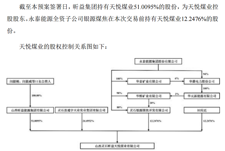 此前,永泰能源全資子公司已持有天悅煤業(yè)12.2476%的股權(quán)。上述交易完成后,永泰能源將合計持有天悅煤業(yè)63.2571%的股權(quán),并將后者納入財務(wù)報表合并范圍。