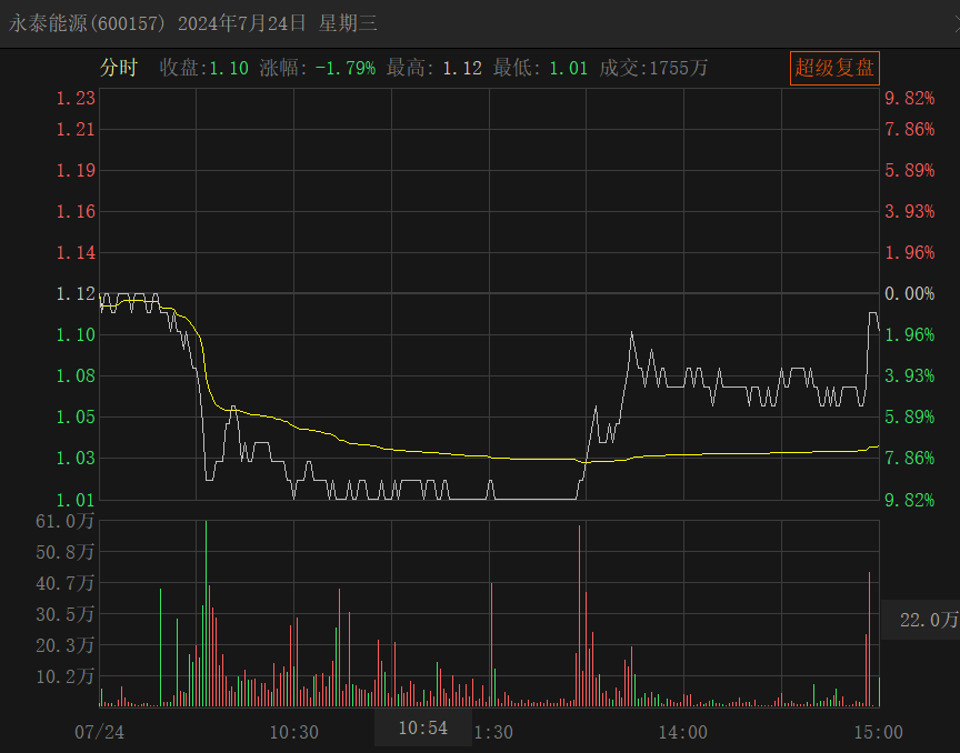以7月24日為例,永泰能源盤中股價觸及跌停達(dá)1.01元/股。之后公司股價有所反彈,截至當(dāng)日收盤的股價為1.1元/股。