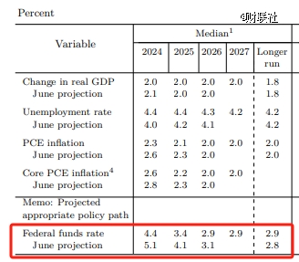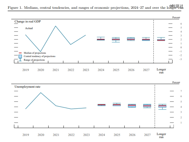 與會(huì)者們將2024年美國(guó)GDP增長(zhǎng)預(yù)期從2.1%下調(diào)至2%,并預(yù)計(jì)未來三年的增長(zhǎng)都將保持在這一數(shù)字,長(zhǎng)期增速保持在1.8%不變;今年的失業(yè)率預(yù)期從4%上調(diào)至4.4%,未來三年分別為4.4%、4.3%和4.2%。