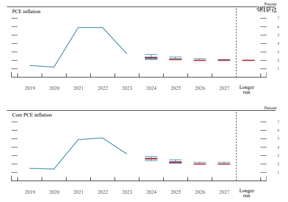 同時(shí),與會(huì)者下調(diào)了對(duì)今明兩年P(guān)CE(個(gè)人消費(fèi)支出)通脹和核心PCE通脹的預(yù)期,其中PCE通脹率從2.6%(2024年預(yù)期)和2.3%(2025年預(yù)期)下調(diào)至2.3%和2.1%,核心PCE則從2.8%和2.3%下調(diào)至2.6%和2.2%。