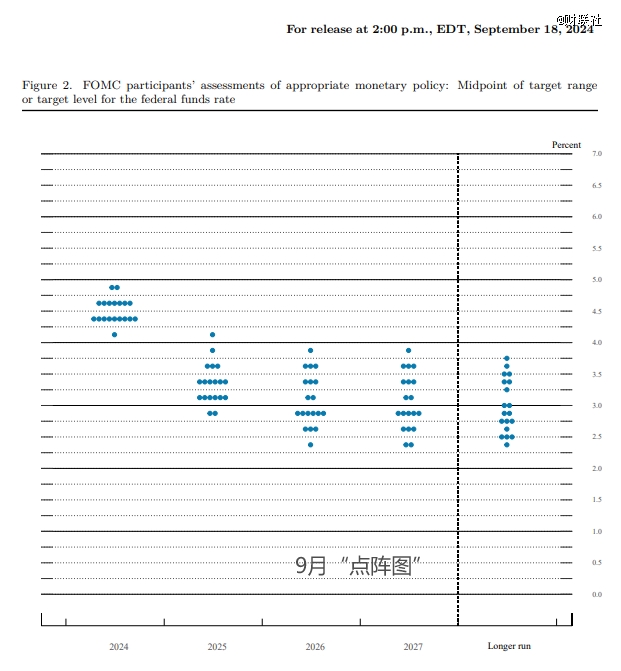 備受關(guān)注的利率預(yù)測(cè)“點(diǎn)陣圖”顯示,19位政策制定者對(duì)2024年末美聯(lián)儲(chǔ)利率預(yù)期的中位數(shù)落在4.25%至4.5%之間。這意味著,他們整體認(rèn)為到年底還會(huì)再當(dāng)前的基礎(chǔ)上再累計(jì)降息50個(gè)基點(diǎn)。