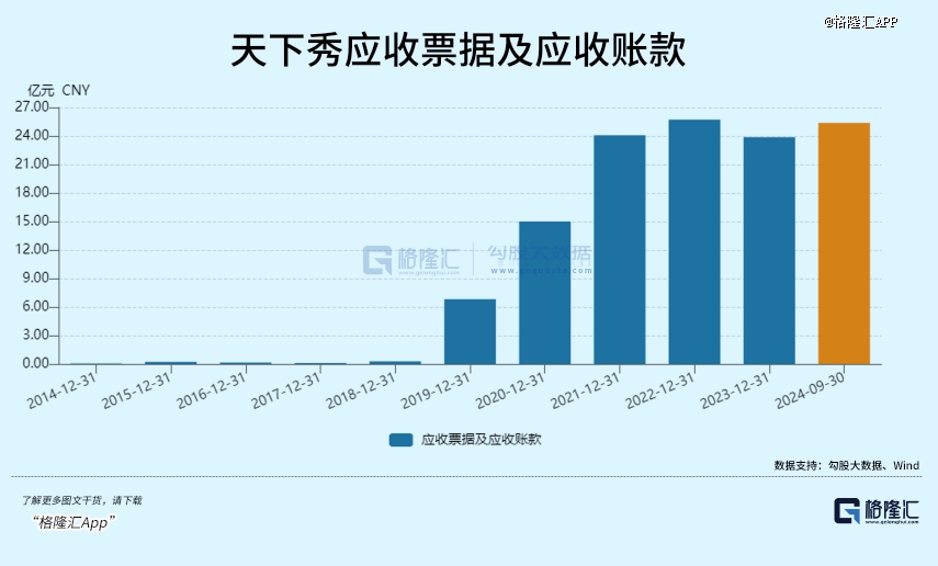 同樣引人關(guān)注的是,天下秀的應(yīng)收賬款體量較大,近幾年來,天下秀的應(yīng)收賬款余額均維持在較高水平,2022年末、2023年末,天下秀應(yīng)收賬款余額分別為26.68億元、25.7億元。到今年前三季度應(yīng)收賬款仍有25.3億,并沒有明顯減少。