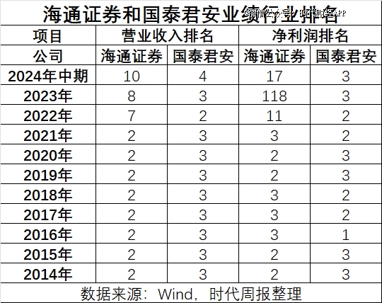 從業(yè)績來看,將時間維度拉長到十年,據(jù)Wind數(shù)據(jù),海通證券與國泰君安此前營業(yè)收入和凈利潤的排名幾乎都在行業(yè)前三,除了“老大哥”中信證券,這兩家券商輪流當“老二”和“老三”。