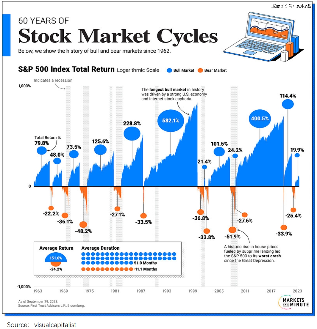 回顧美股1961年以來(lái)的60多年歷史會(huì)發(fā)現(xiàn),美股的牛市比熊市要長(zhǎng)得多——牛市平均持續(xù)63個(gè)月,平均漲幅達(dá)到182%;熊市平均持續(xù)時(shí)長(zhǎng)14個(gè)月,平均跌幅只有36%。