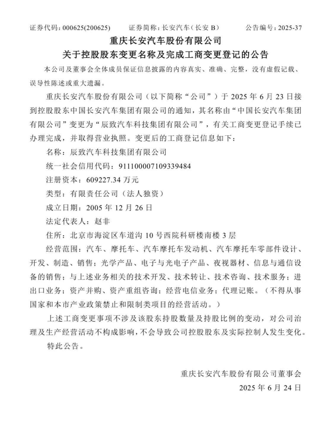 6月23日晚間,重慶長安汽車(000625)股份有限公司(以下簡稱“長安汽車”;000625)發(fā)布公告稱,公司接到控股股東中國長安汽車集團有限公司通知,其名稱由“中國長安汽車集團有限公司”變更為“辰致汽車科技集團有限公司”,并已完成工商變更登記手續(xù)。
