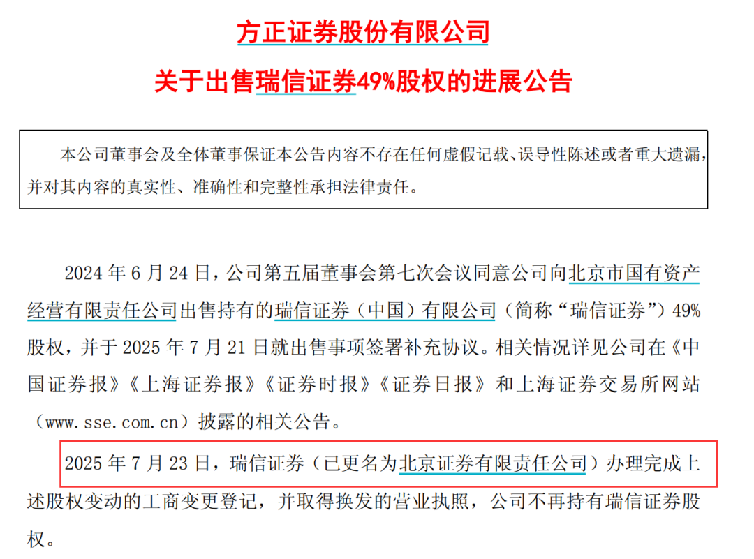 7月23日,方正證券(601901)發(fā)布公告稱,瑞信證券(已更名為北京證券有限責任公司)完成股權變動的工商變更登記,公司不再持有瑞信證券股權。