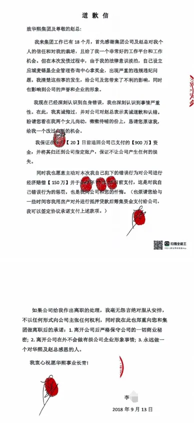 華熙生物在聲明中提到,事發(fā)后,華熙昕宇向公安機(jī)關(guān)報(bào)案。公安機(jī)關(guān)經(jīng)立案?jìng)刹?,根?jù)相關(guān)規(guī)定,移送司法機(jī)關(guān)提起公訴。在偵查期間,為減輕罪責(zé),李某向華熙生物寫下了道歉信,公司堅(jiān)持依法辦事,對(duì)其提出的除退還900萬元侵占款外額外給予賠償?shù)囊蟛挥柚美怼?/p>
