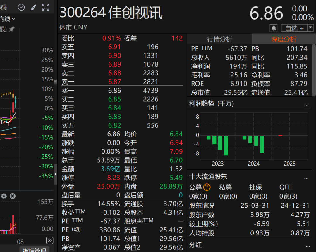 8月1日,佳創(chuàng)視訊股價報收于6.86元/股,總市值為29.56億元。
