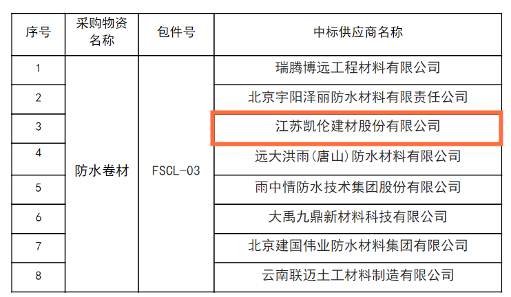 近日,中鐵三局集團有限公司(下稱“中鐵三局”)2025年度區(qū)域集中采購防水材料中標結(jié)果公布,凱倫股份(300715)憑借專業(yè)的系統(tǒng)服務和品牌認可度成功中標。