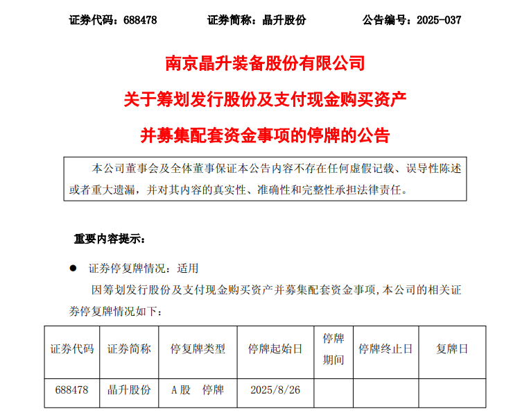 對(duì)于本次交易是否構(gòu)成重大資產(chǎn)重組及關(guān)聯(lián)交易的具體認(rèn)定,晶升股份將在重組預(yù)案或重組報(bào)告書中予以詳細(xì)分析和披露。本次交易不會(huì)導(dǎo)致公司實(shí)際控制人發(fā)生變更,不構(gòu)成重組上市。根據(jù)相關(guān)規(guī)定,公司股票將于8月26日(星期二)開市起停牌,預(yù)計(jì)停牌時(shí)間不超過10個(gè)交易日。