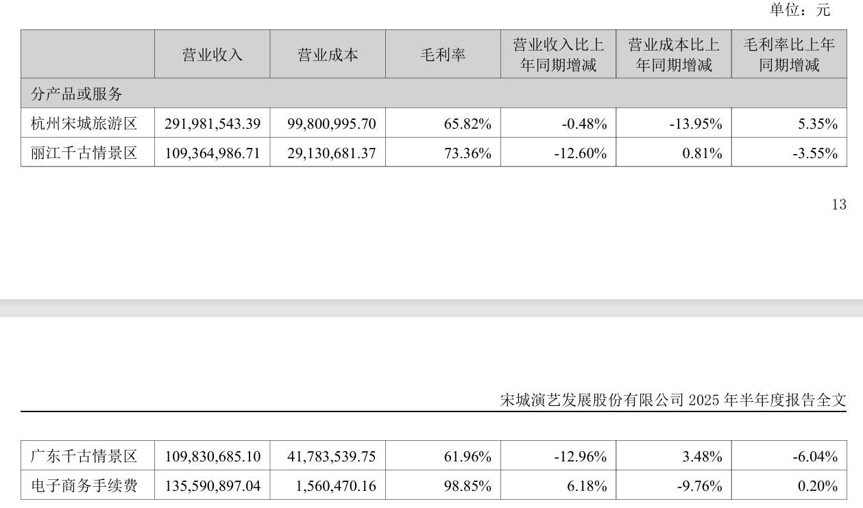 宋城演藝上半年部分產(chǎn)品營收、毛利情況;來源:公司公告