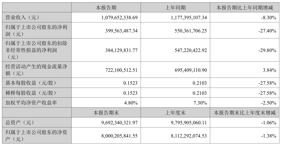 從公司上半年的營收、利潤情況看,財(cái)報(bào)顯示,今年上半年,公司營業(yè)收入10.8億元,同比下降8.30%;歸母凈利潤4億元,同比下降27.4%;扣非凈利潤3.84億元,同比下降29.8%;截至報(bào)告期末,公司總資產(chǎn)為96.92億元,同比下滑-1.06%。