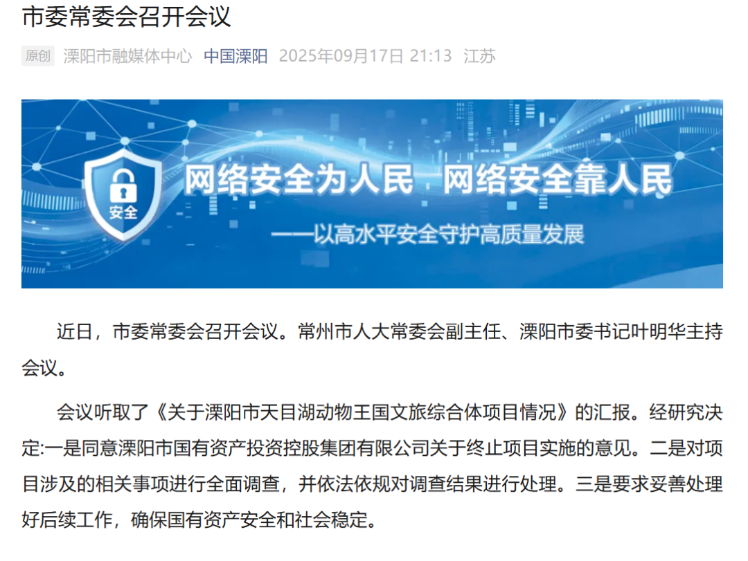 會議聽取了《關(guān)于溧陽市天目湖動物王國文旅綜合體項目情況》的匯報。經(jīng)研究決定:一是同意溧陽市國有資產(chǎn)投資控股集團有限公司關(guān)于終止項目實施的意見。二是對項目涉及的相關(guān)事項進行全面調(diào)查,并依法依規(guī)對調(diào)查結(jié)果進行處理。三是要求妥善處理好后續(xù)工作,確保國有資產(chǎn)安全和社會穩(wěn)定。