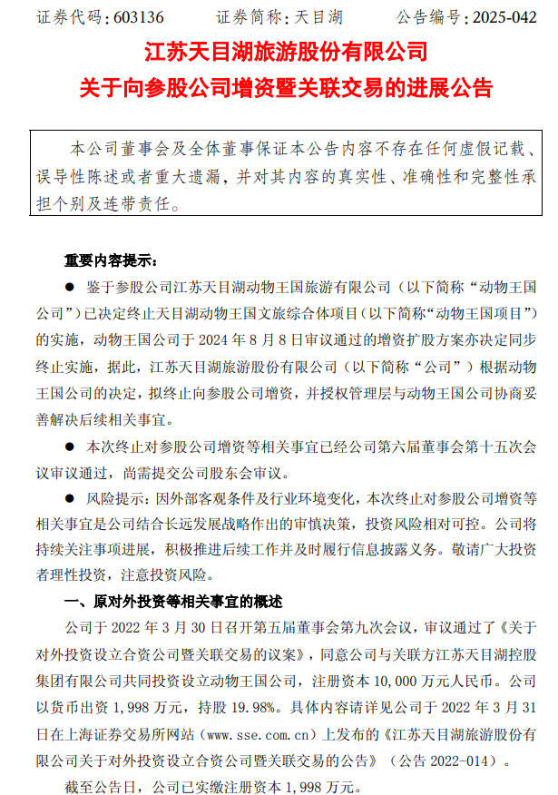 9月17日晚,A股上市公司天目湖發(fā)布公告稱,鑒于參股公司江蘇天目湖動物王國旅游有限公司(以下簡稱“動物王國公司”)已決定終止天目湖動物王國文旅綜合體項目(以下簡稱“動物王國項目”)的實施,動物王國公司于2024年8月8日審議通過的增資擴股方案亦決定同步終止實施,據(jù)此,江蘇天目湖旅游股份有限公司(以下簡稱“公司”)根據(jù)動物王國公司的決定,擬終止向參股公司增資,并授權(quán)管理層與動物王國公司協(xié)商妥善解決后續(xù)相關(guān)事宜。
