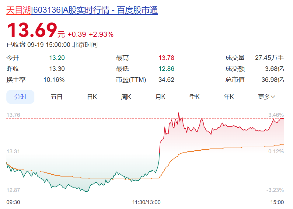 9月19日,天目湖股價先跌后漲,截至收盤漲近3%。