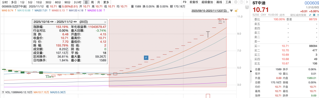 數(shù)據(jù)顯示,ST中迪股價(jià)自10月16日至11月12日期間,累計(jì)漲幅高達(dá)153.19%,其間更是出現(xiàn)七次股價(jià)異常波動(dòng)。這種劇烈的股價(jià)波動(dòng)與公司基本面形成鮮明對比。截至11月11日,ST中迪靜態(tài)市盈率為-12.83倍,滾動(dòng)市盈率為-15.88倍,市凈率為-376.33倍,而同期中國上市公司協(xié)會行業(yè)分類房地產(chǎn)業(yè)的靜態(tài)市盈率為28.62倍,滾動(dòng)市盈率為26.19倍,市凈率為0.93倍。公司各項(xiàng)估值指標(biāo)與行業(yè)平均水平存在嚴(yán)重偏離,顯示出股價(jià)波動(dòng)嚴(yán)重背離公司基本面。