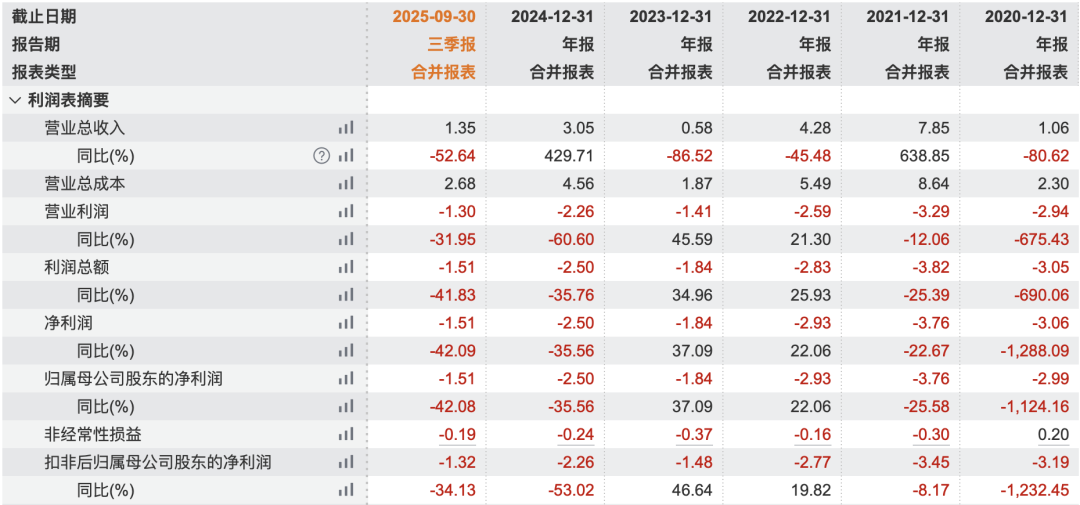 盡管股價(jià)大幅上漲,但ST中迪的經(jīng)營狀況依然嚴(yán)峻。根據(jù)公司披露的財(cái)務(wù)數(shù)據(jù),2025年前三季度,該公司營業(yè)收入為1.35億元,同比下降52.64%;利潤總額為-1.51億元,同比下降41.83%。更為嚴(yán)峻的是,ST中迪2022年度、2023年度、2024年度三個(gè)會計(jì)年度扣除非經(jīng)常性損益前后凈利潤孰低者均為負(fù)值,且2024年度審計(jì)報(bào)告顯示公司持續(xù)經(jīng)營能力存在重大不確定性。這導(dǎo)致公司股票被繼續(xù)實(shí)施其他風(fēng)險(xiǎn)警示。